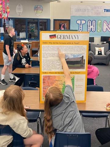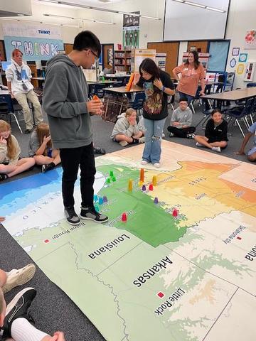 Students were divided into six groups representing England, Scotland, Ireland, Germany, Spain, and France. During the first activity, students completed a sticky note and map exercise to explore why people from each country came to Texas. In the second activity, students used colored cups to represent population numbers and placed them on a large map showing the regions where settlers established communities.